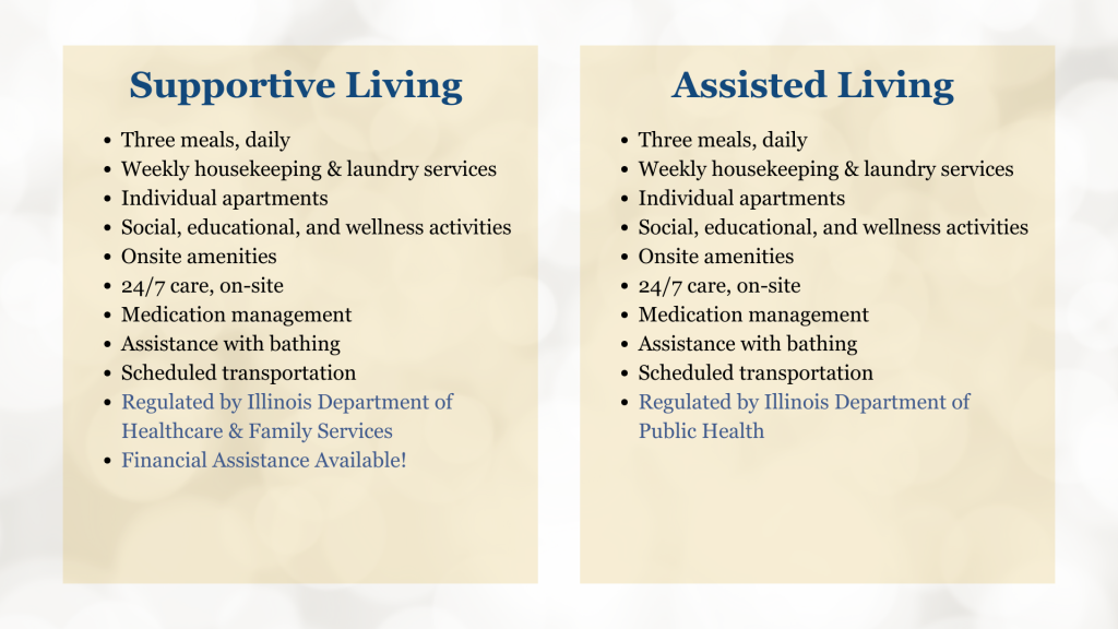 Supportive Living is a Medicaid-supported model of assisted living, however it is open to all persons aged 65 and older who meet eligibility requirements. Seniors can choose to pay their monthly rent privately OR they can apply for Medicaid benefits for support. Those who access Medicaid benefits in a Supportive Living community enjoy all of the amenities, but their monthly cost of living is subsidized by the state of Illinois.