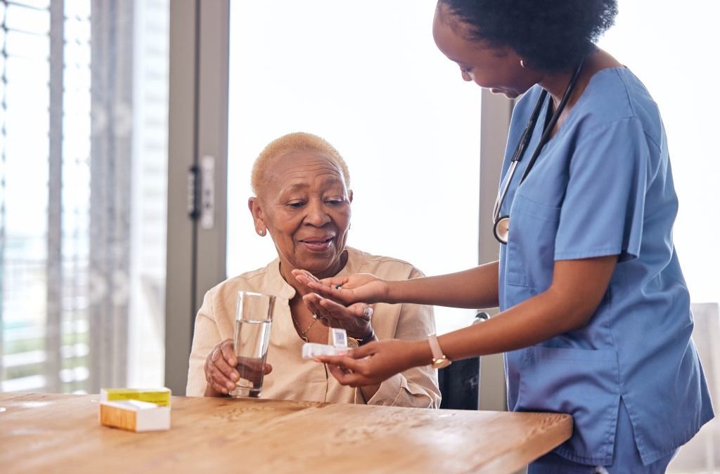 A nurse passing medicine in assited living community
